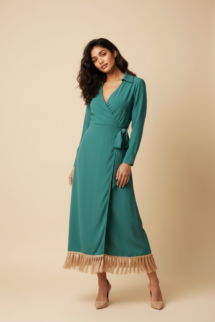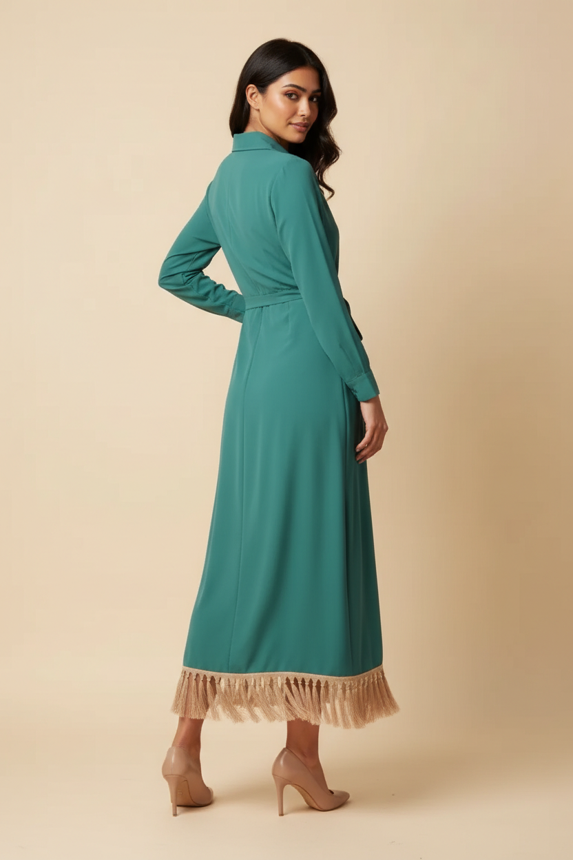💚 Vestido verde con flecos beige – espíritu feria total